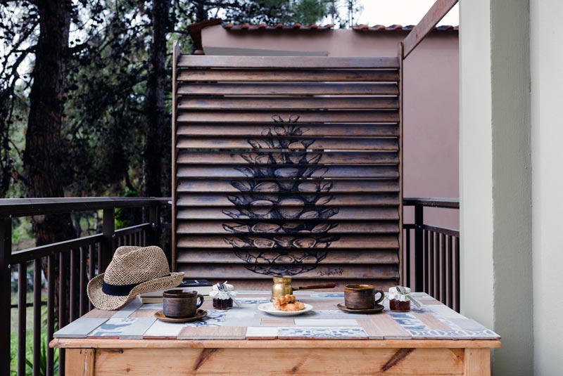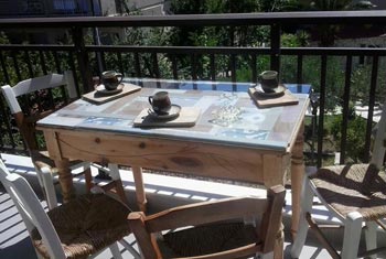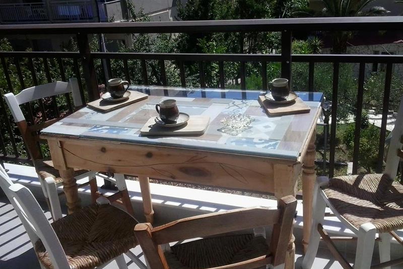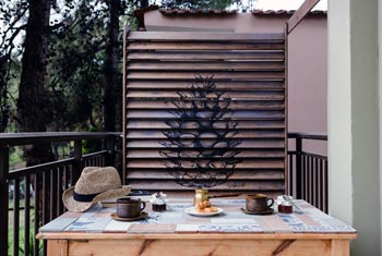 ● A private balcony with a dining table and chairs.