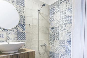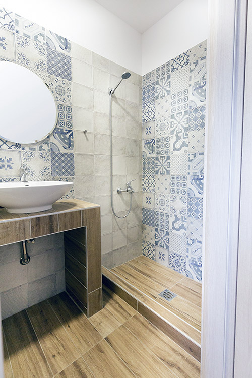 ● A stylish bathroom with shower and hair dryer.