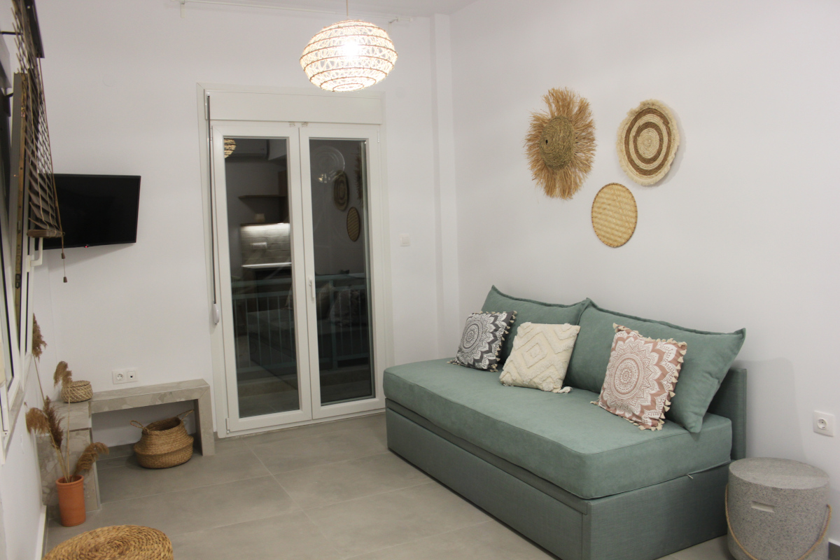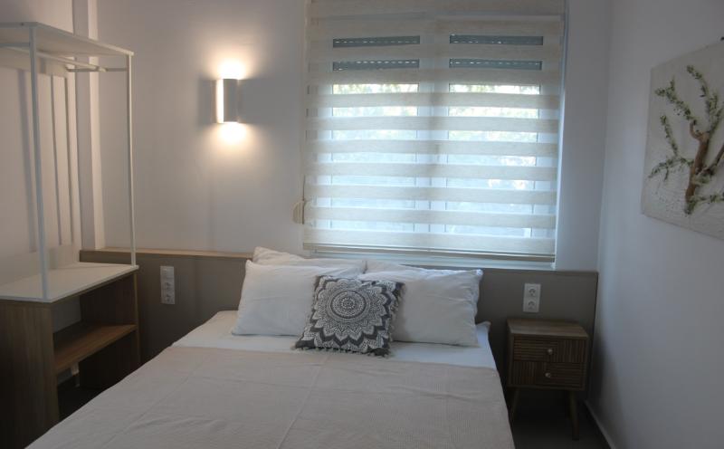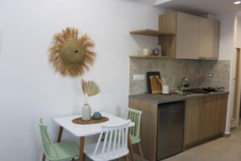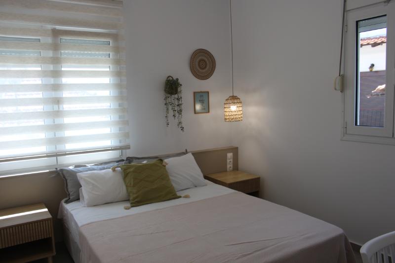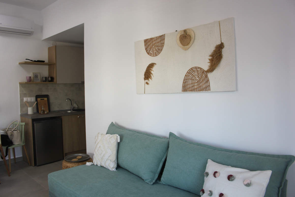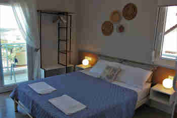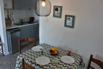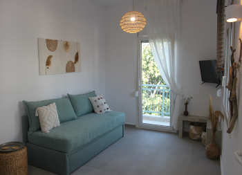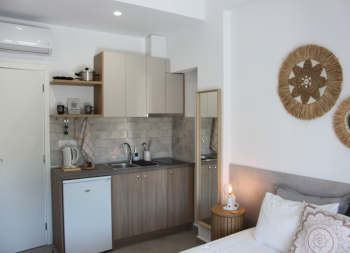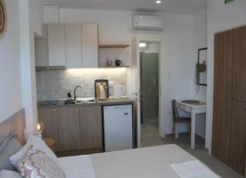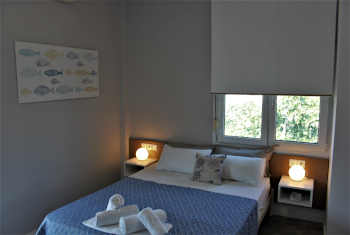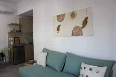 sofa beds for two people and kitchen. The bedroom has a double bed