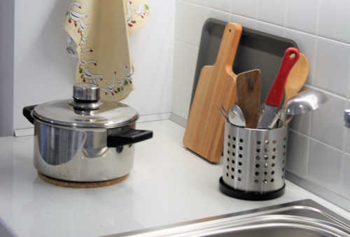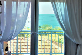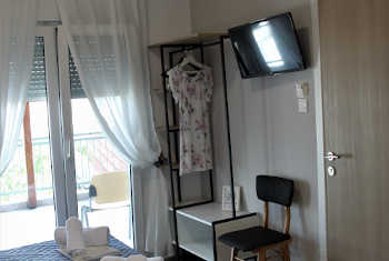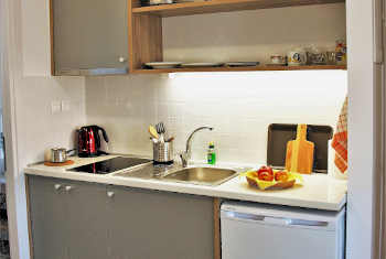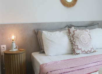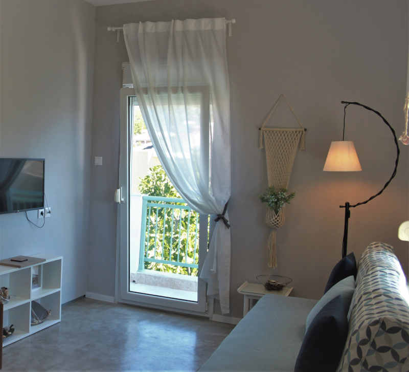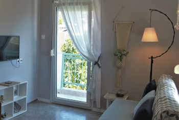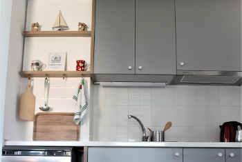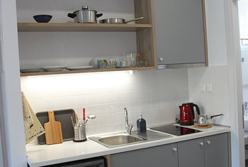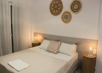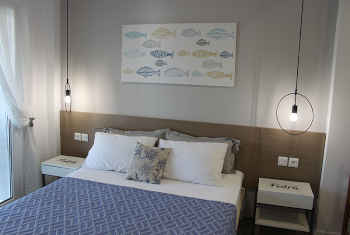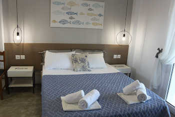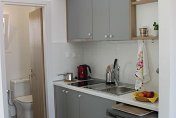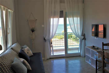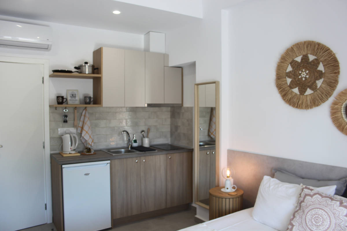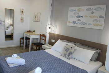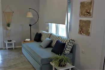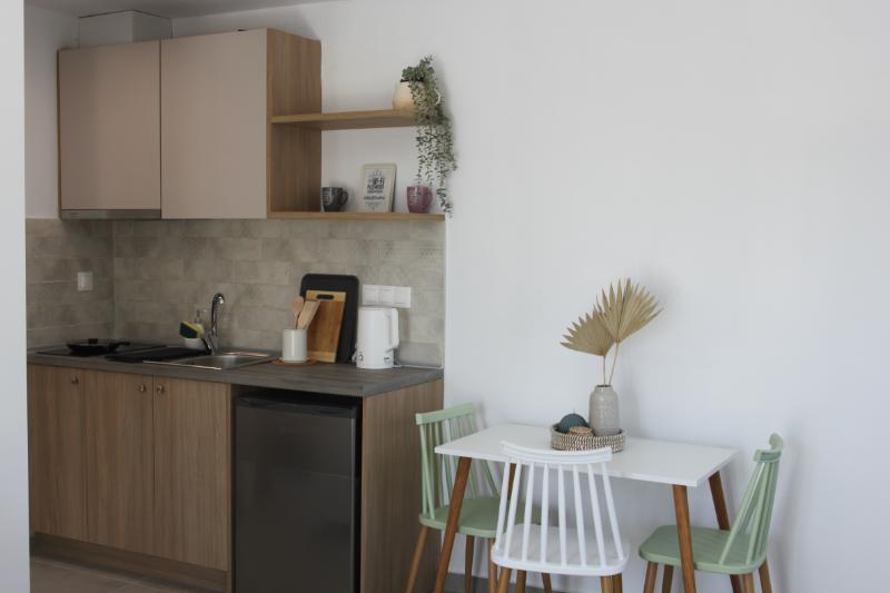 sofa beds for two people and kitchen. The bedroom has a double bed